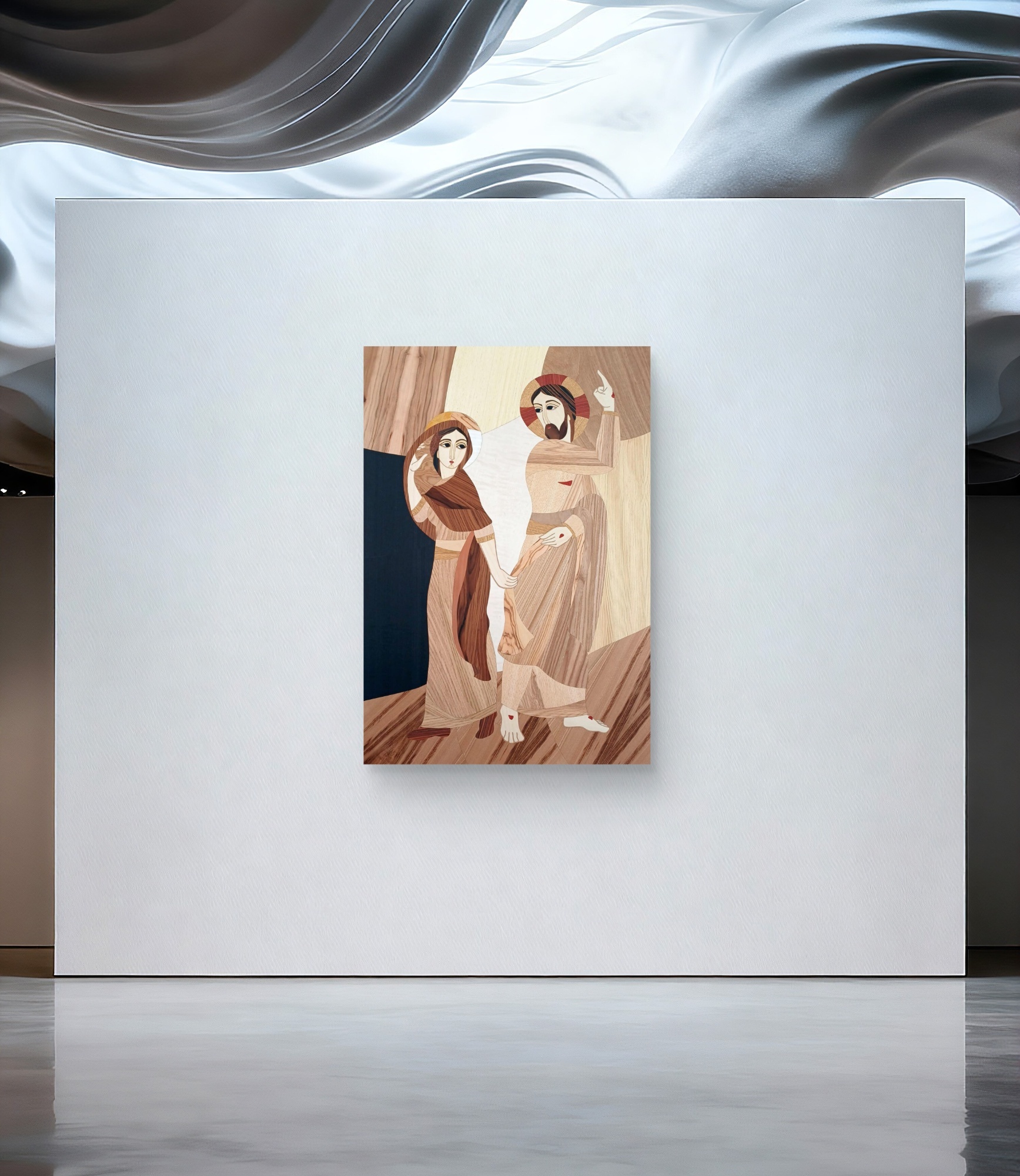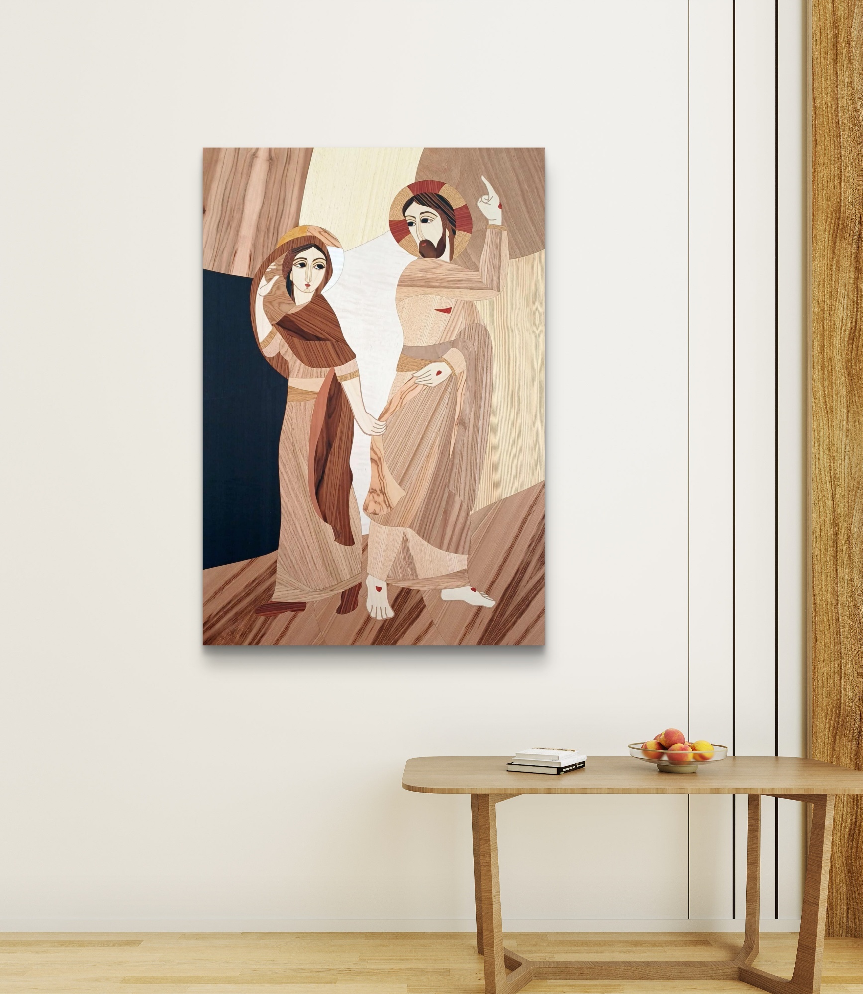 Intarsio ligneo ispirato alla scena dell'incontro tra Maria Maddalena e Cristo Risorto.